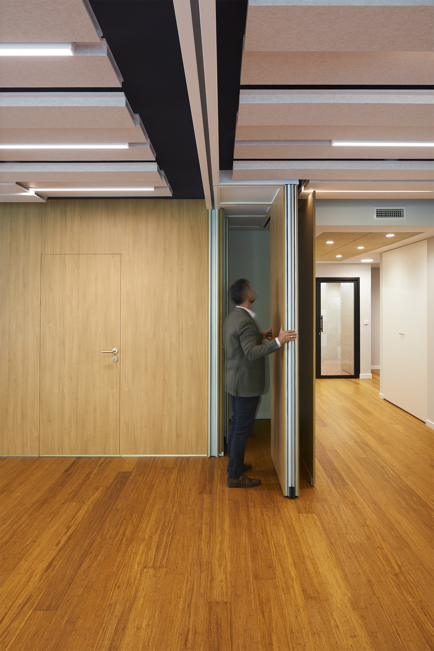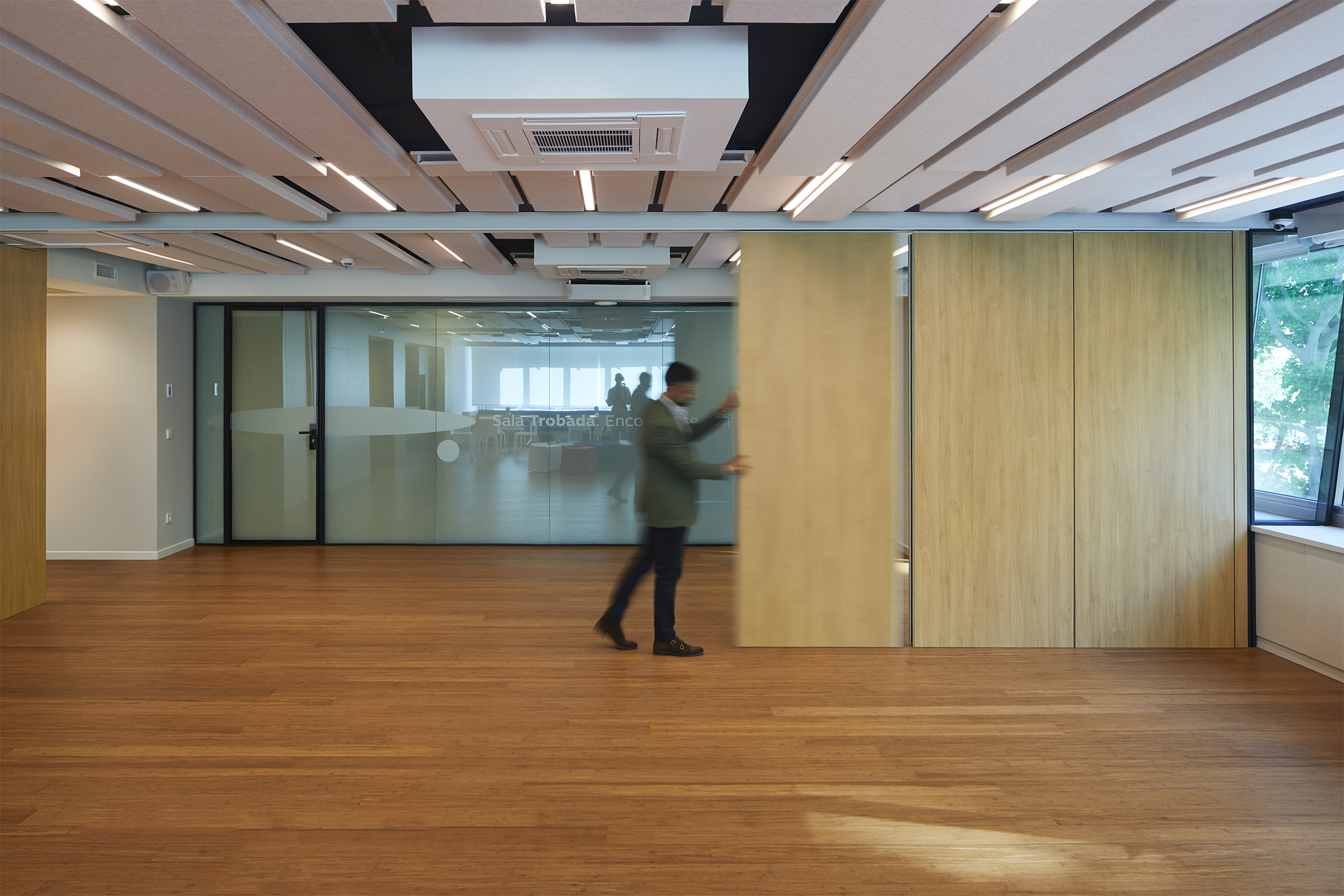 Uno de los elementos clave del proyecto es la incorporación de tabiques móviles, que permiten configurar salas de diferentes dimensiones, abrir o cerrar espacios y adaptarlos tanto a reuniones, sesiones de trabajo colaborativo o eventos.