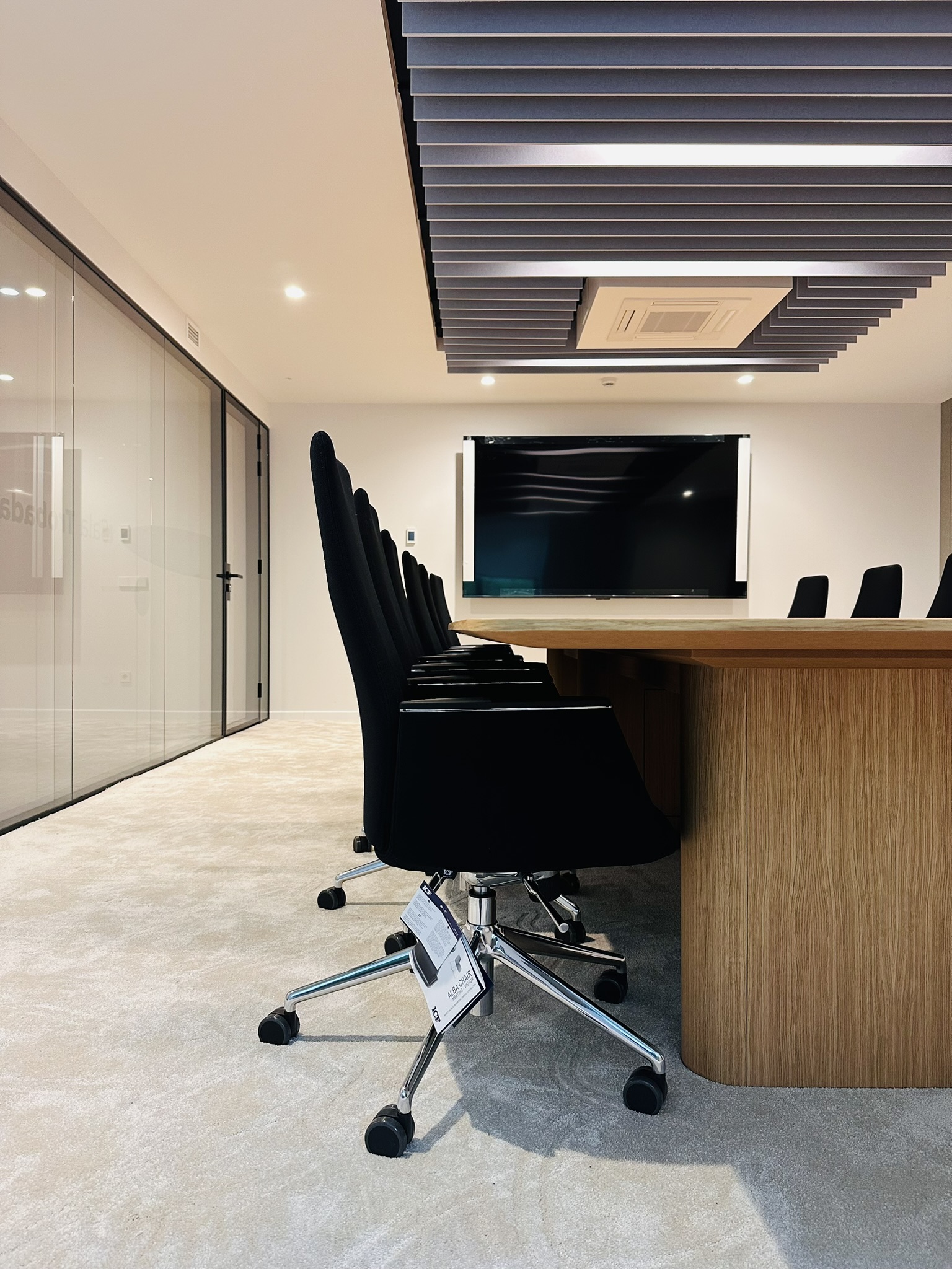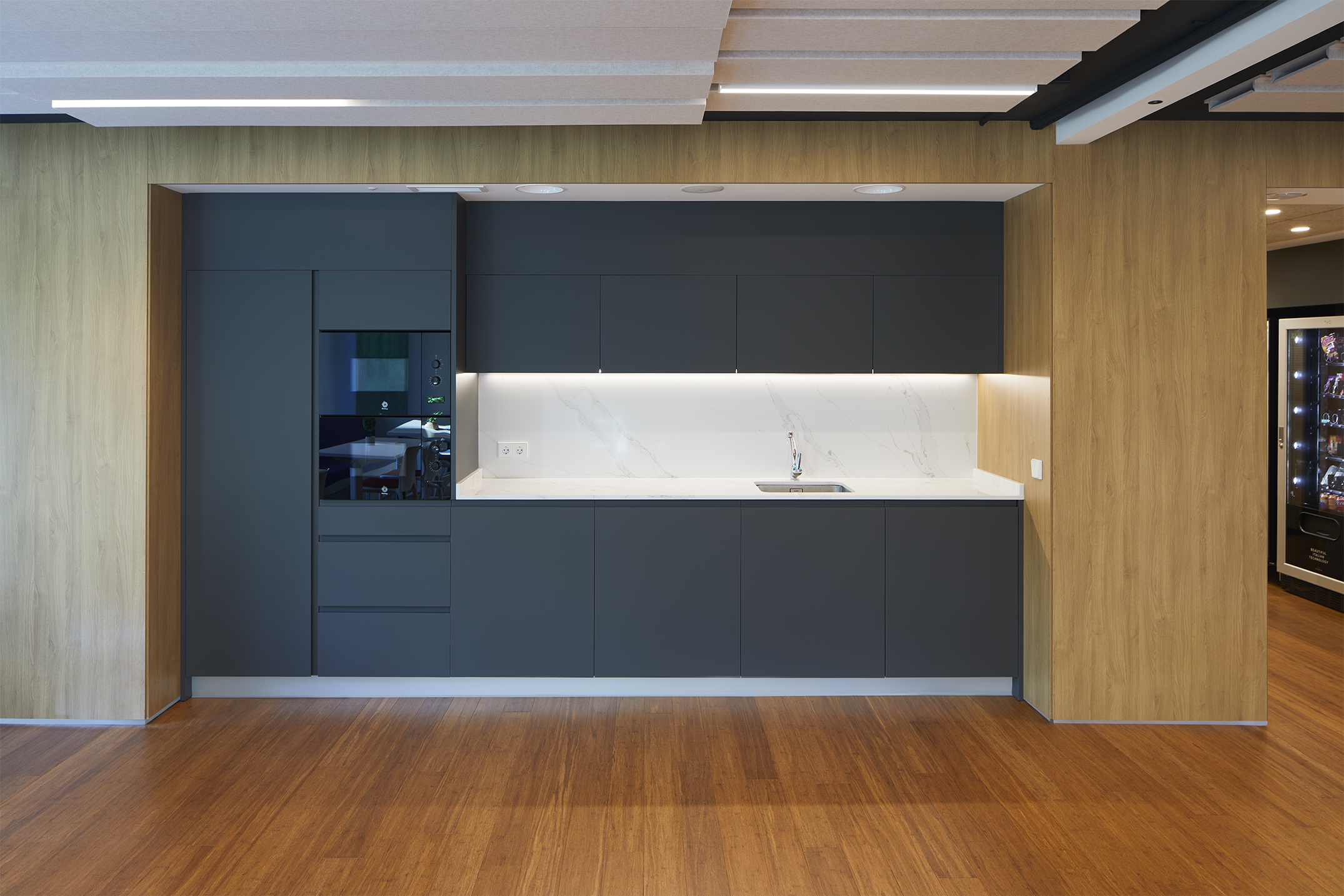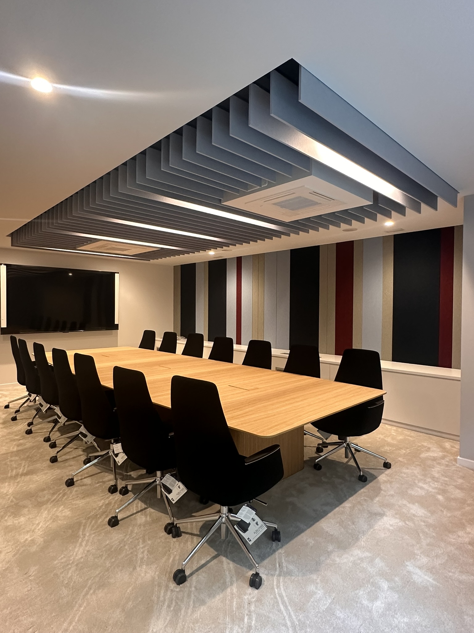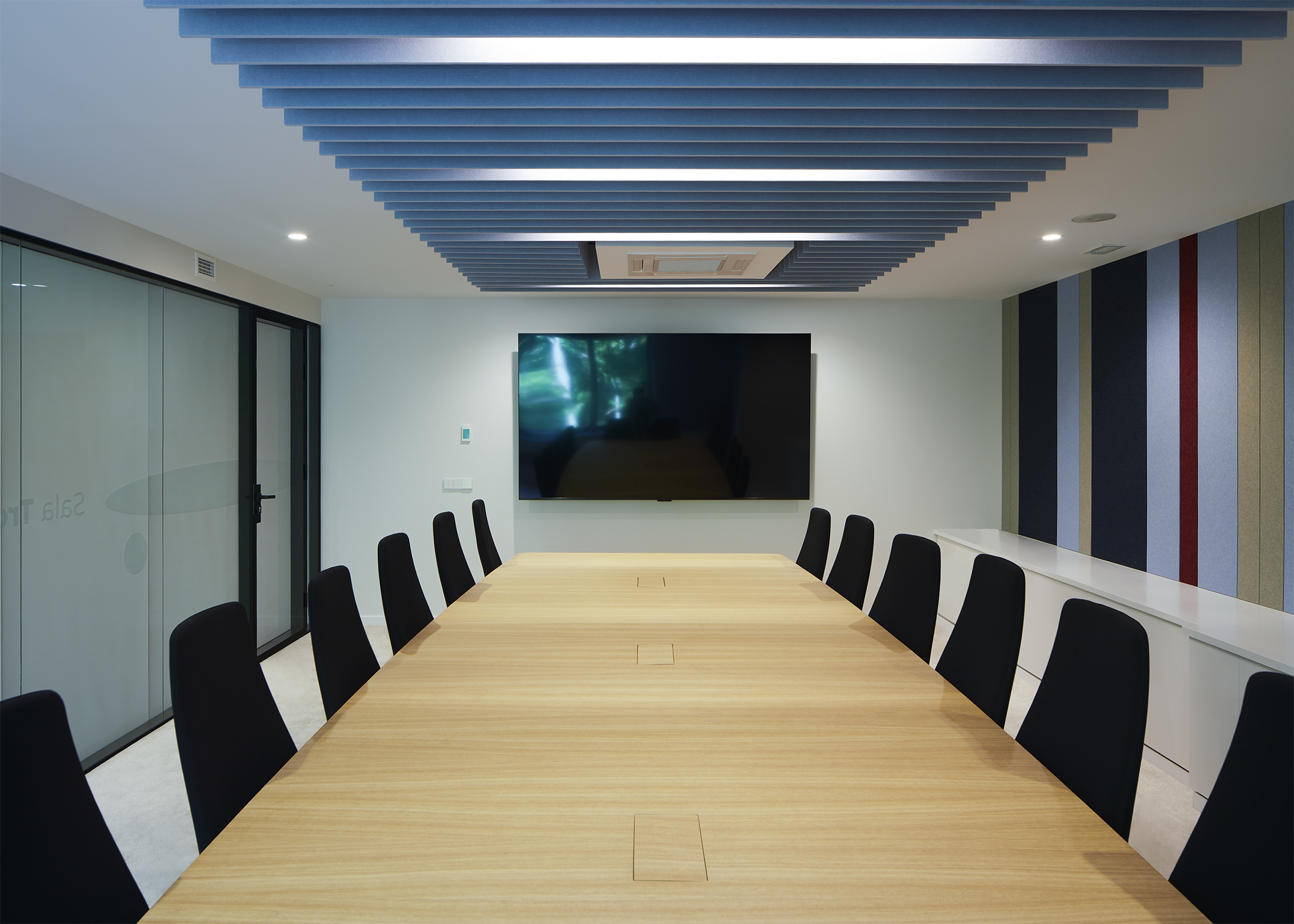 El tratamiento del techo mediante baffles y paneles fonoabsorbentes no solo mejora el confort acústico, sino que también refuerza la identidad visual del espacio, aportando ritmo, orden y una estética contemporánea.