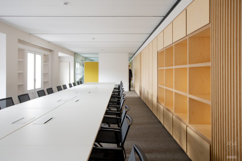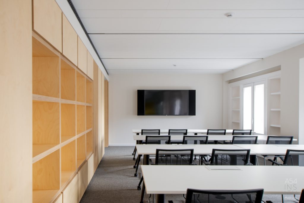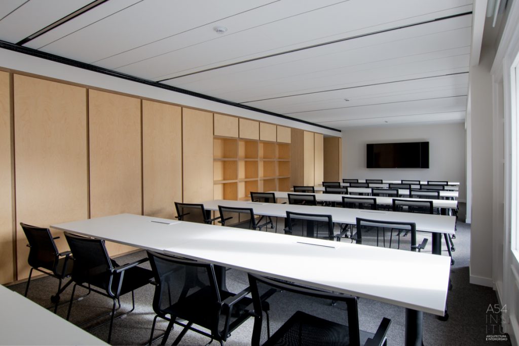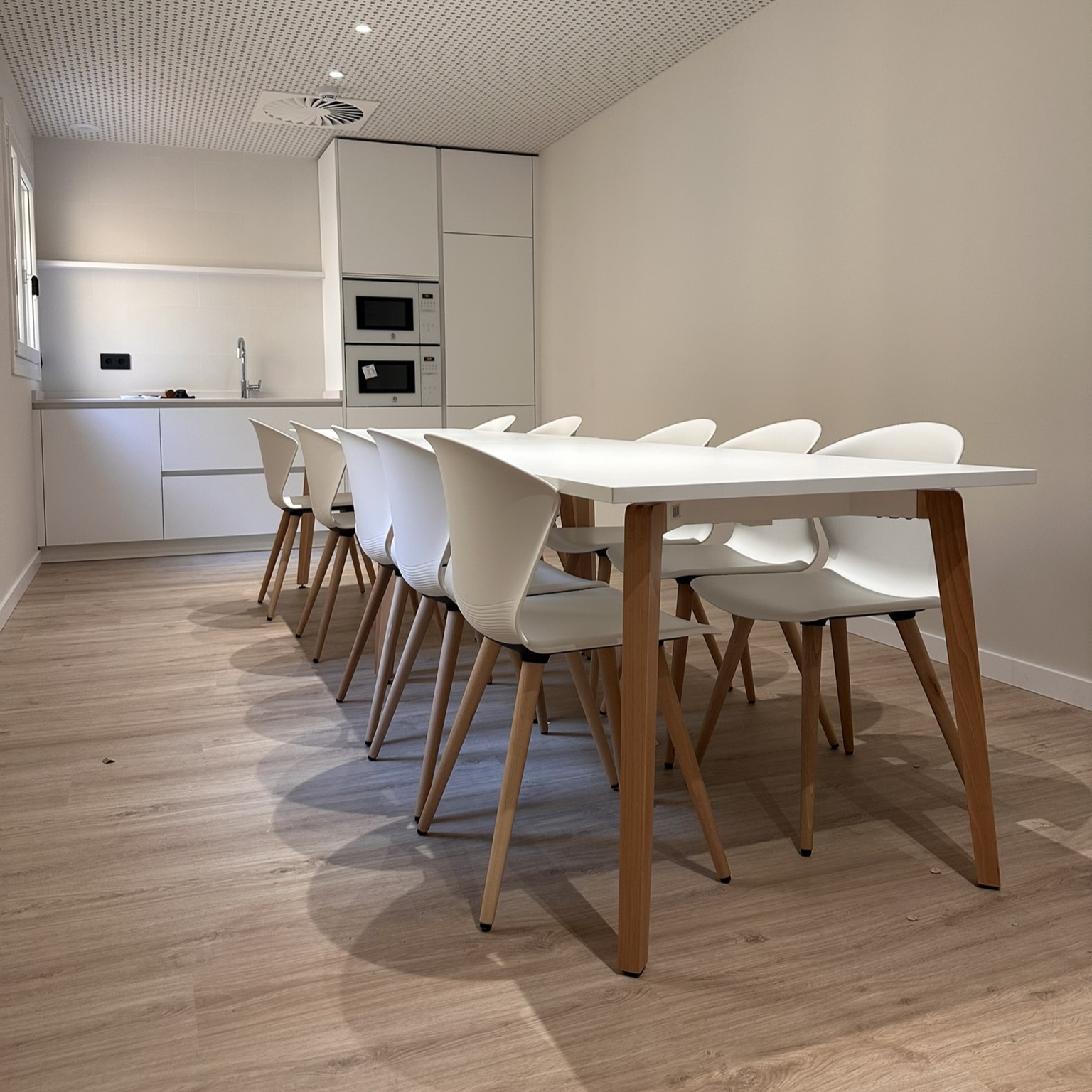 Equipamiento completo del mobiliario de oficina, taller, recepción, salas de reuniones y zonas de office.